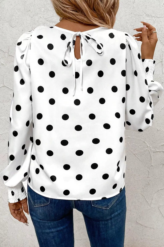 Blouse met ronde hals ruches stippenprint en lange mouwen