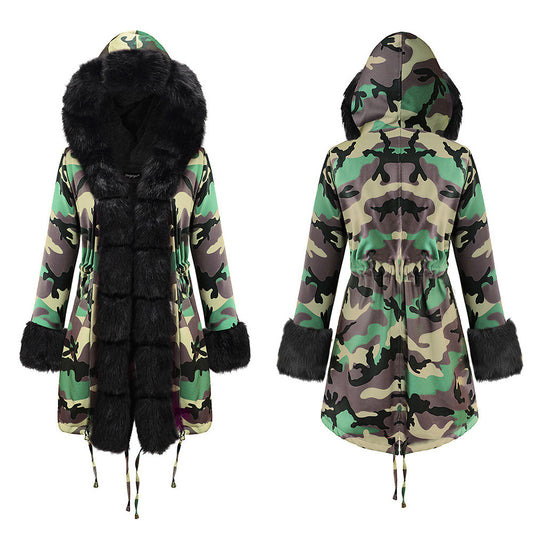 Dames katoenen jas met grote bontkraag en middellange lengte
