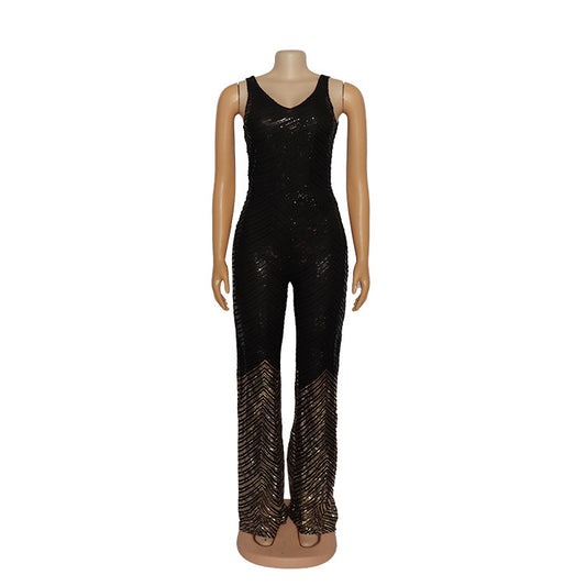 Sexy hoge stretch jumpsuit met diepe V-hals en pailletten