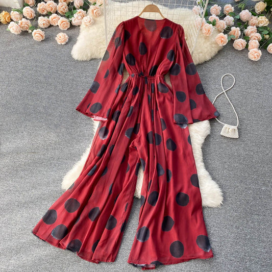 Tingfly Franse Chi Polka Dot Print Bohemian Casual Wijde Pijpen Jumpsuit