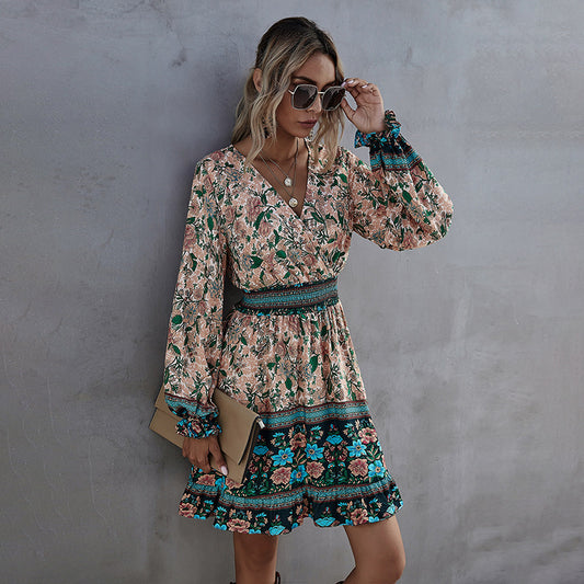 Dames hoge taille geplooide A-lijn rok casual bohemian print jurk