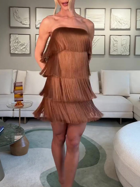 Bruine strapless mini-jurk met gelaagde franjes