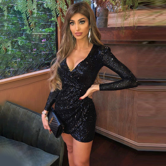 Amerikaanse mini-jurk met V-hals lange mouwen en pailletten