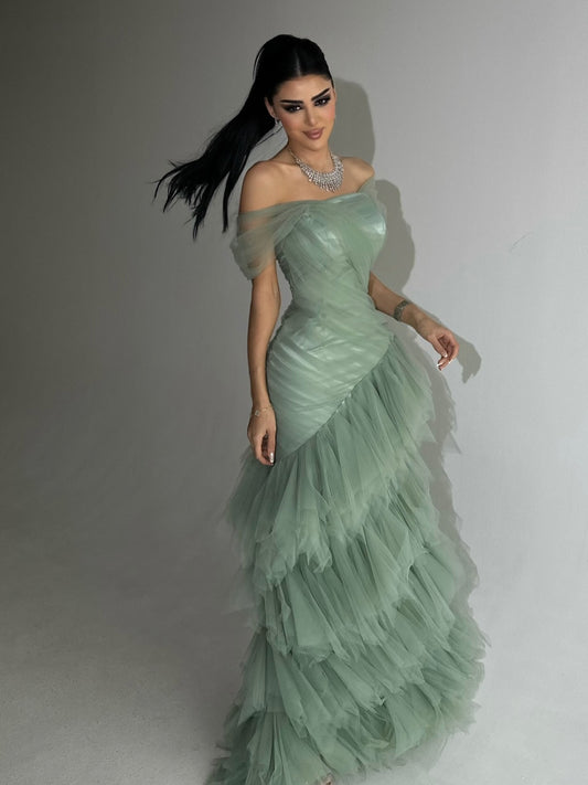 Elegante lichtgroene strapless zeemeerminjurk met gelaagde tule rok