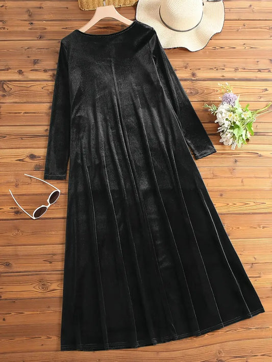 Effen velours damesjurk met lange mouwen en zakken
