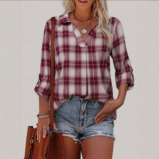 Geruit Overhemd Met V-hals Knopen Casual Europese Stijl