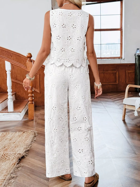 Tweedelige set bestaande uit een tanktop en een broek met oogjesborduurwerk