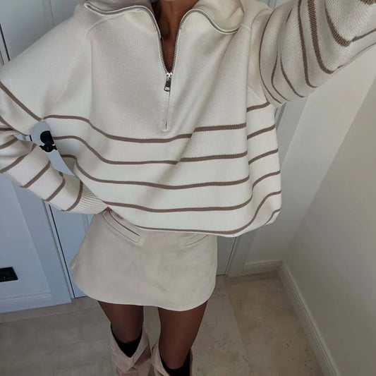 Losse gebreide gestreept trui met halve rits en omslagkraag