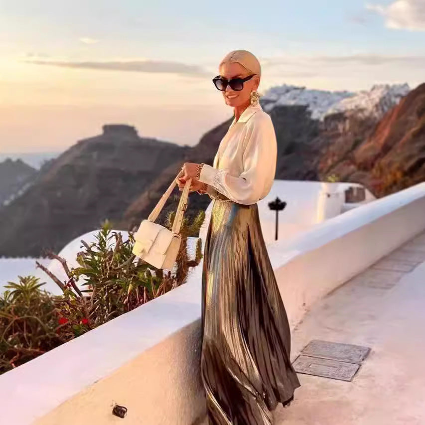 Satijnen overhemd met lange mouwen of glanzend maxi-rok