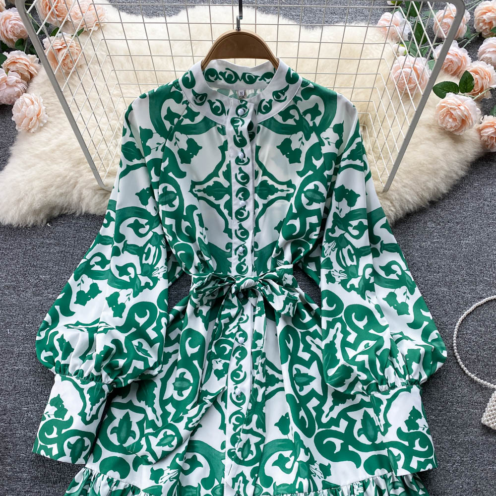 Modeontwerper catwalkjurk lente/herfst dames lange lantaarnmouwen enkele rij knopen
