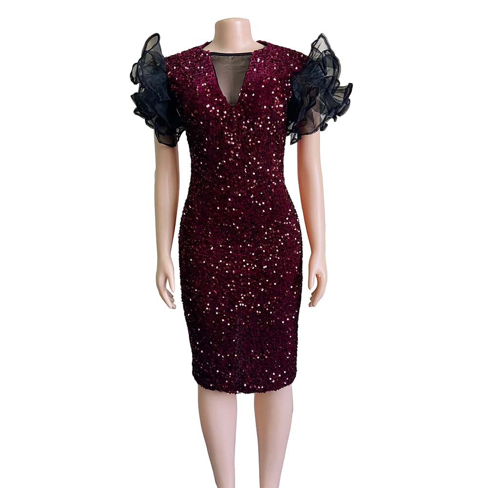 Midi-jurk met pailletten en mesh pofmouwen
