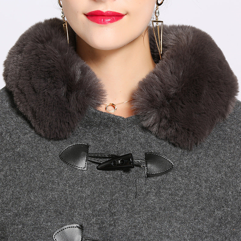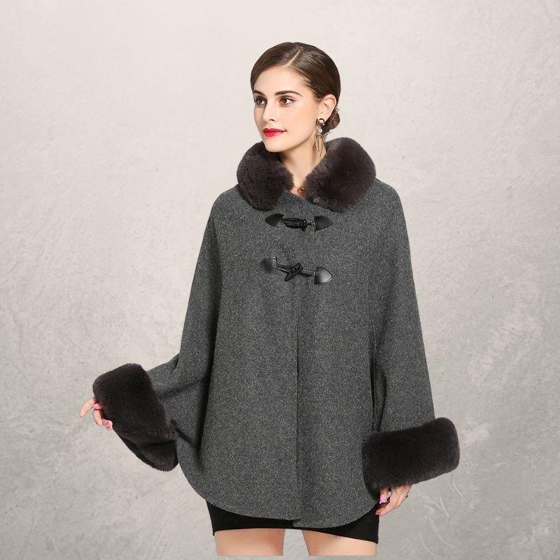 Europese wollen cape met imitatiebontkraag dubbele PU-leren sluiting