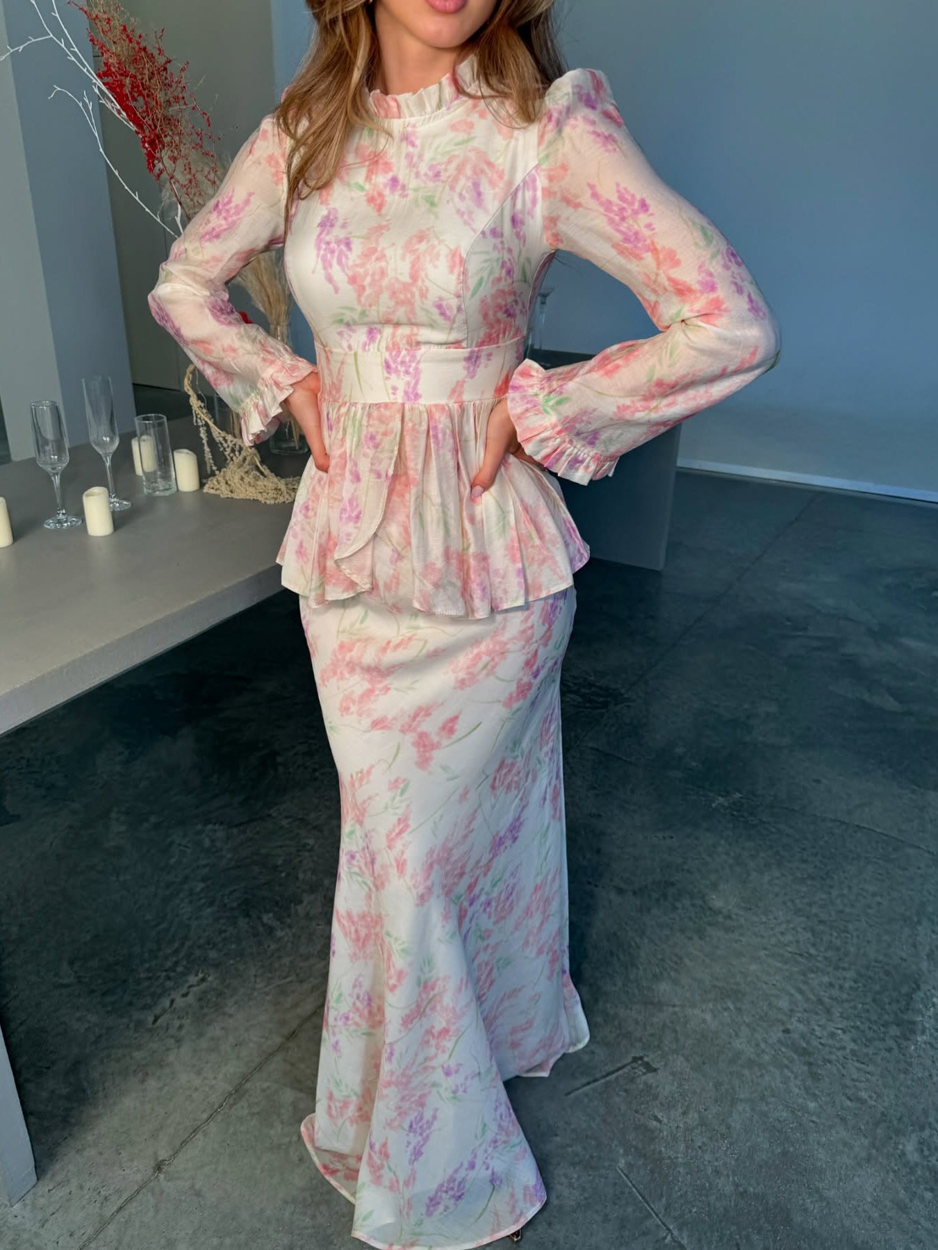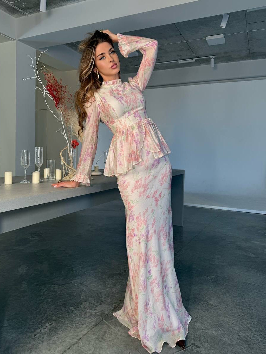 Set van top met bloemenprint ruches en rok met hoge taille en visgraatmotief