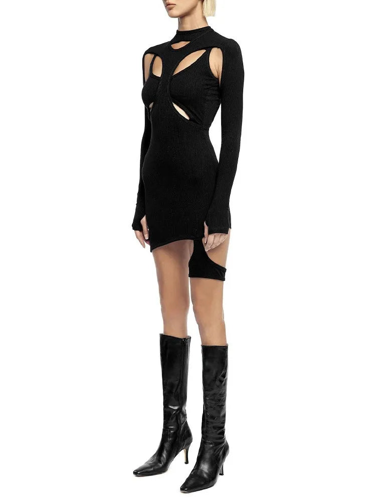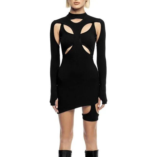 Sexy slanke geribde jurk met open details ronde hals en lange mouwen