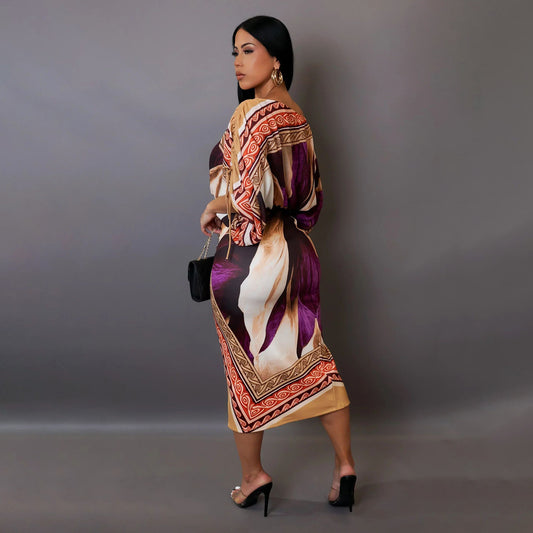V-Neck Lange Mouw Geplooide Jurk met Strik En Gerimpelde Taille
