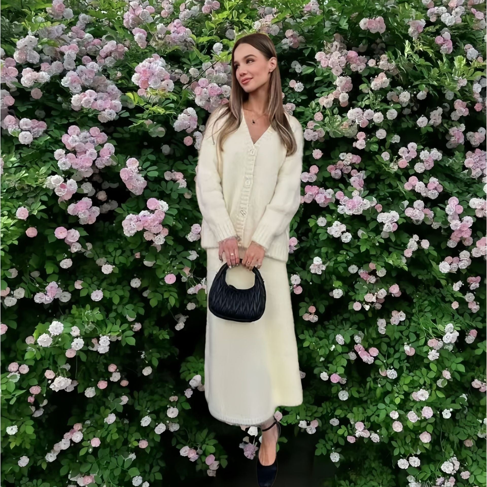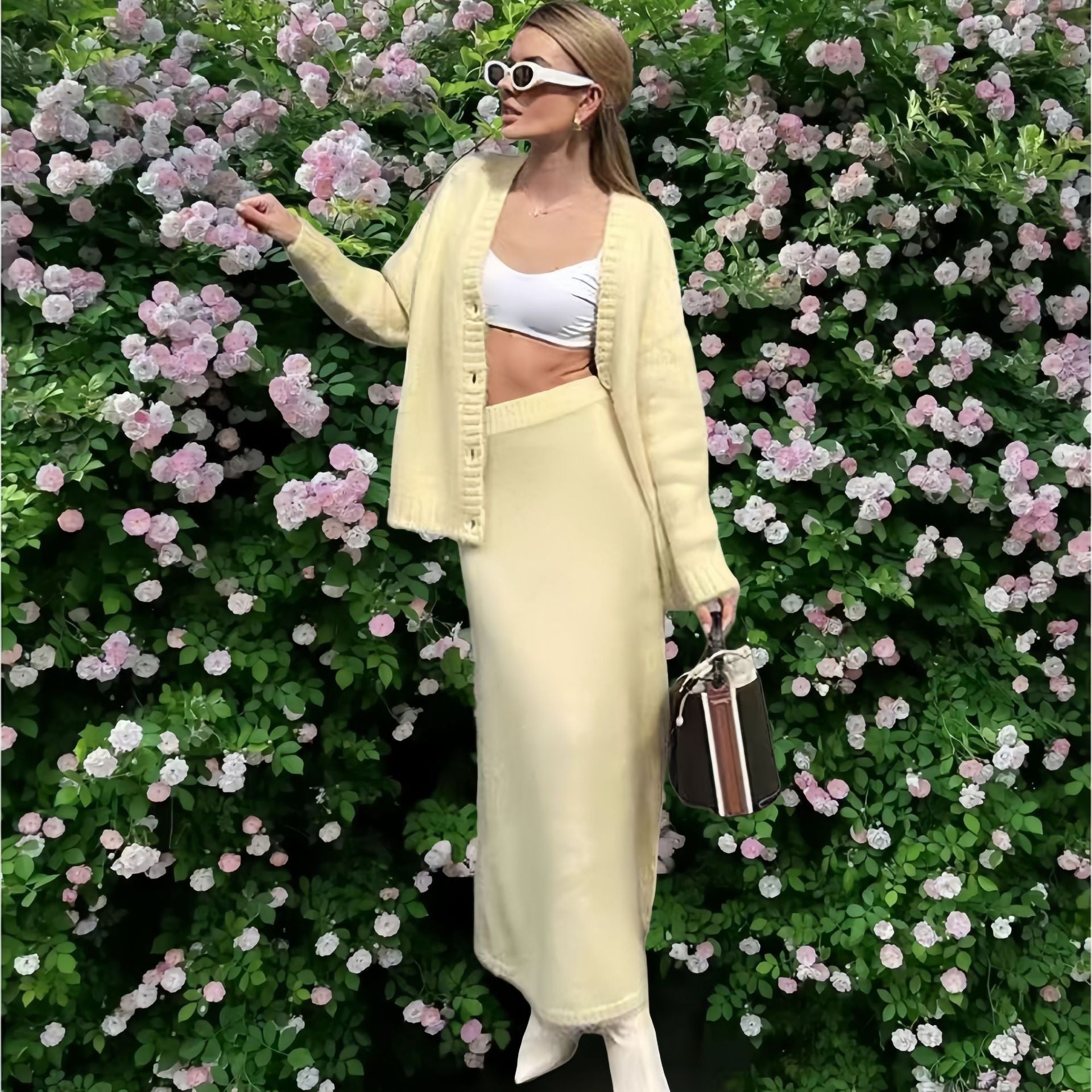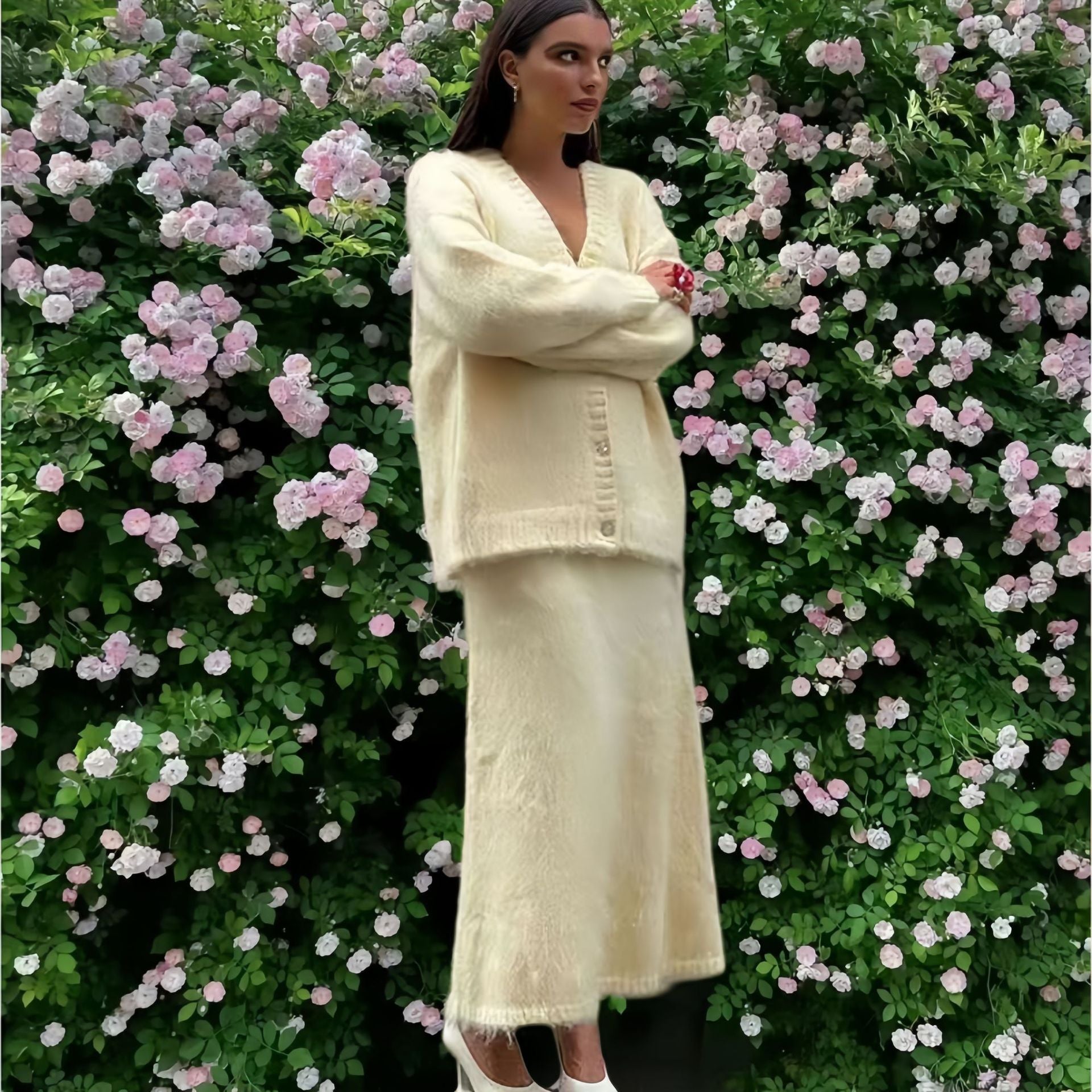Eelegante gebreide V-hals trui of vest plus rok set