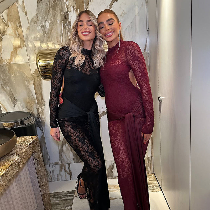 Kanten strik ronde hals lange mouwen jurk met cut out