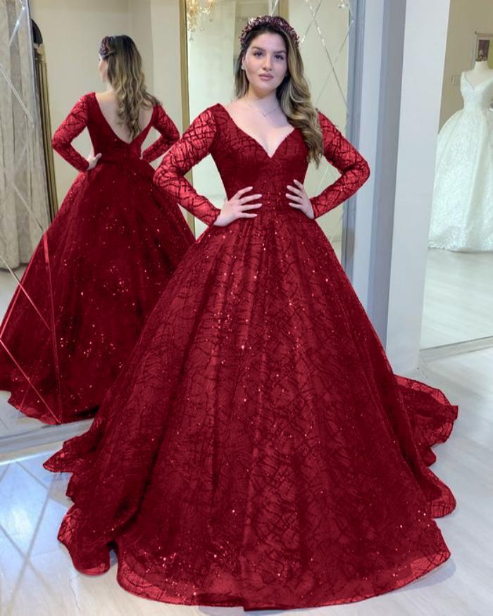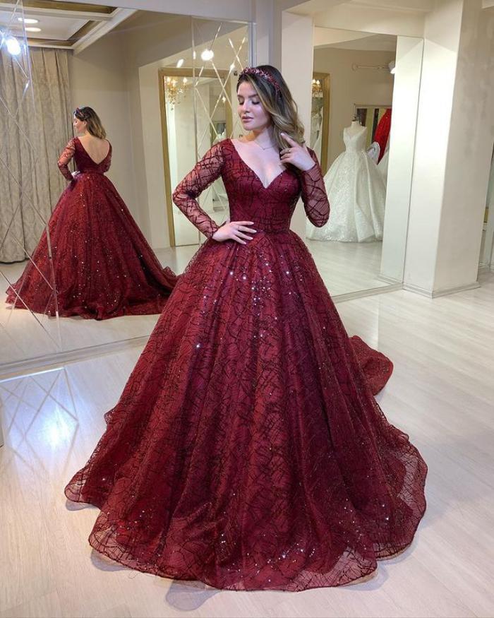 Lange kanten galajurk met lange mouwen en diepen V-hals