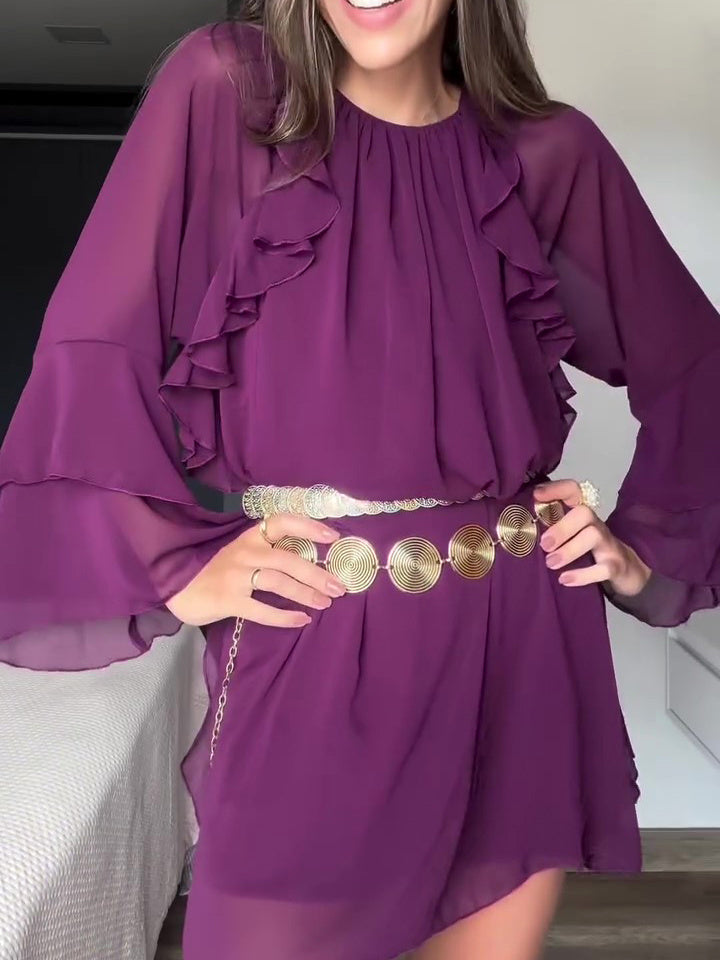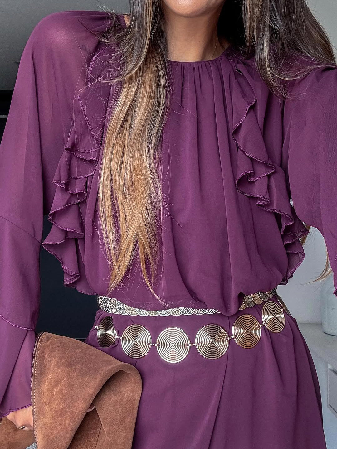 Pruimenkleurige Boheemse jurk met ruches en lange mouwen