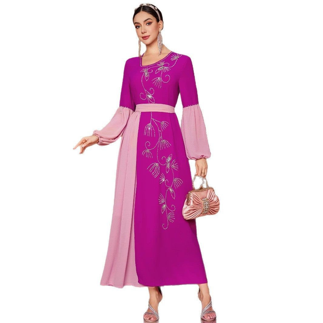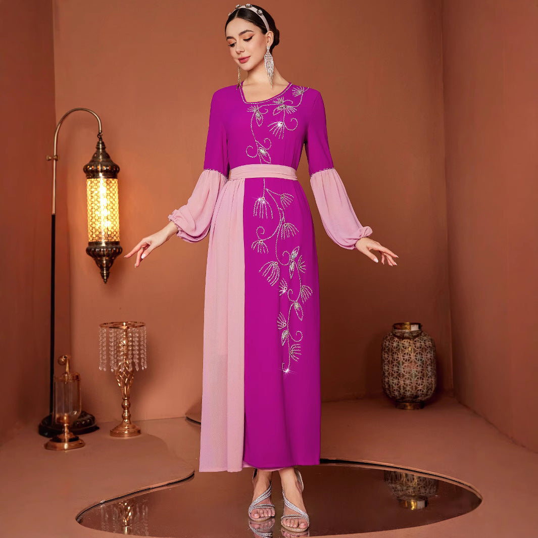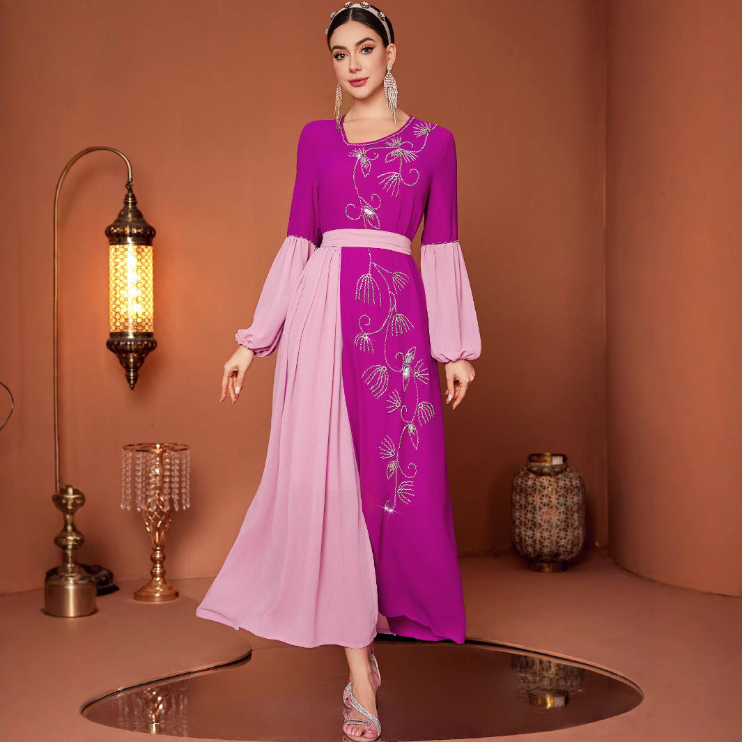Rozenrode elegante chiffonjurk met handgestikte ruitvormige omtrek